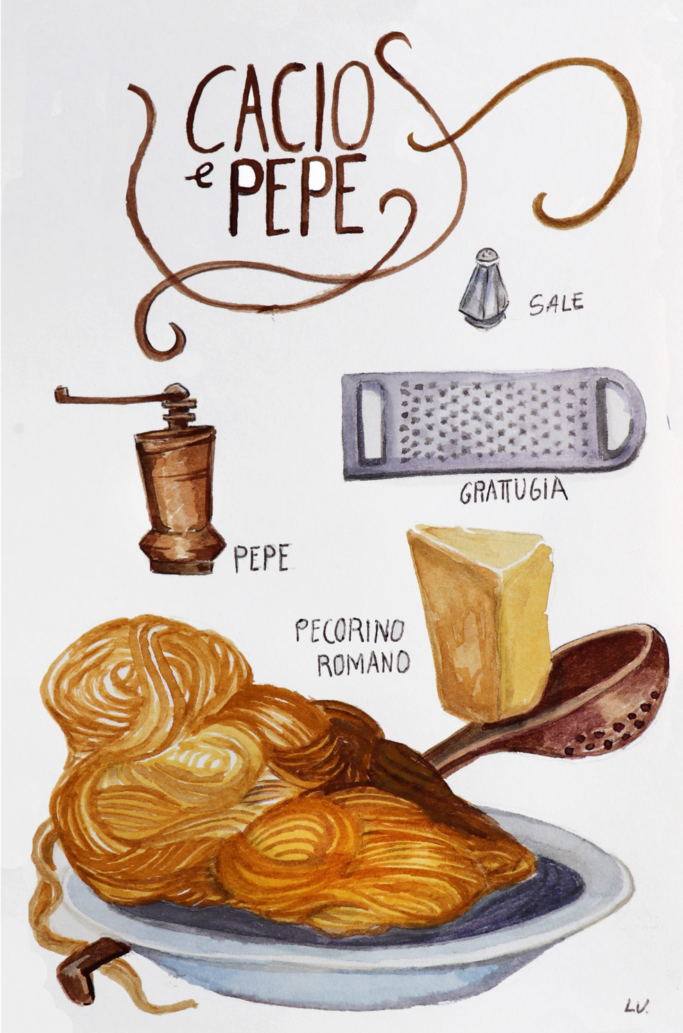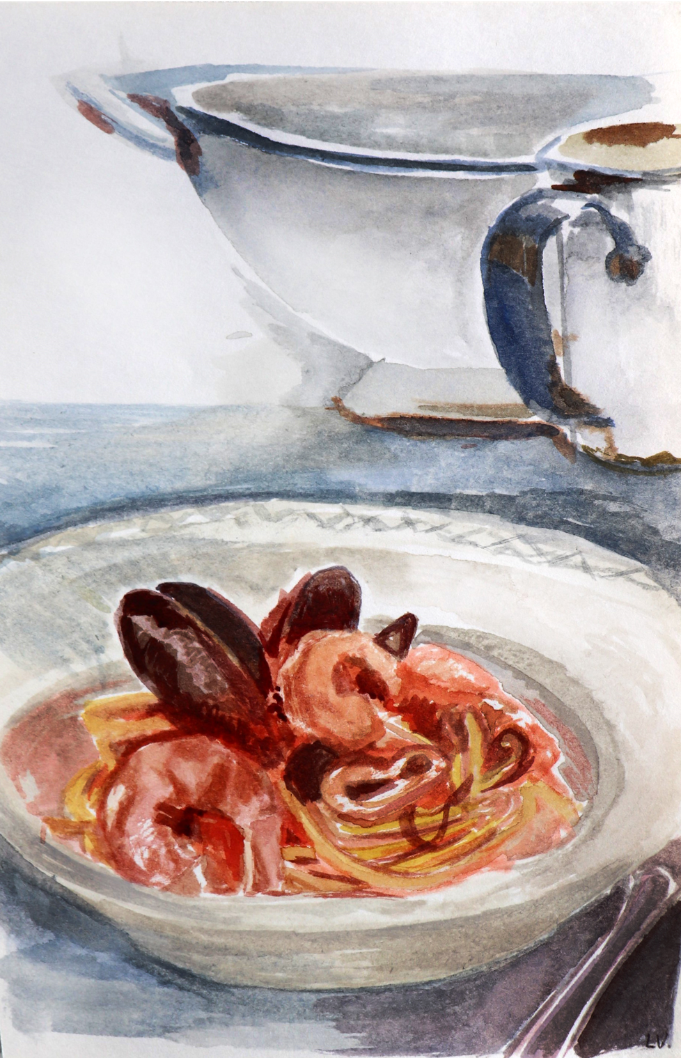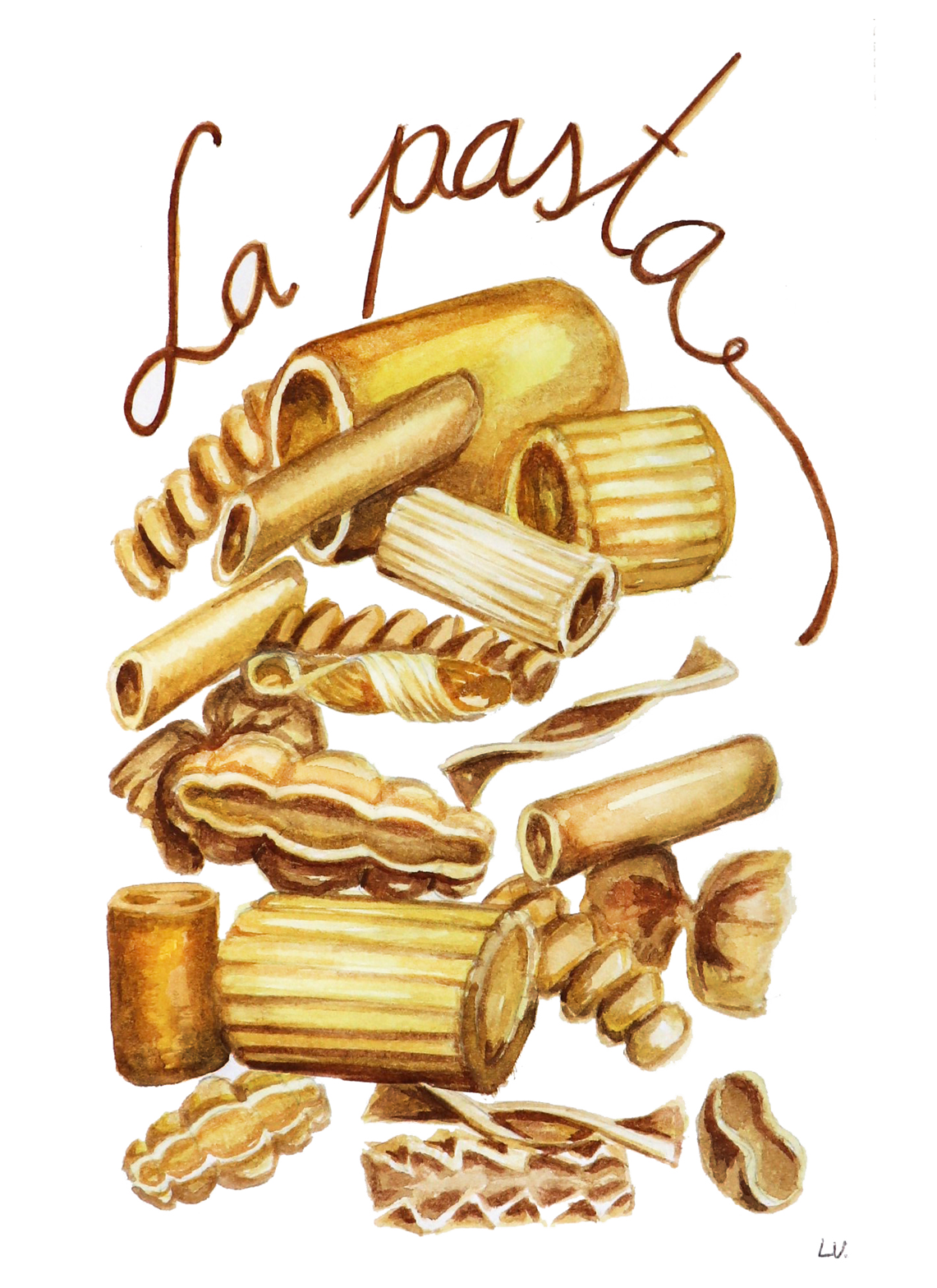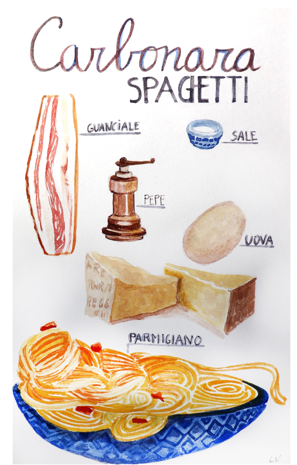 Taking Italian gastronomic culture as a subject, I painted different motifs in watercolour: recipes and other stereotypes. Exhibited at “Da Massimo” in Augsburg.