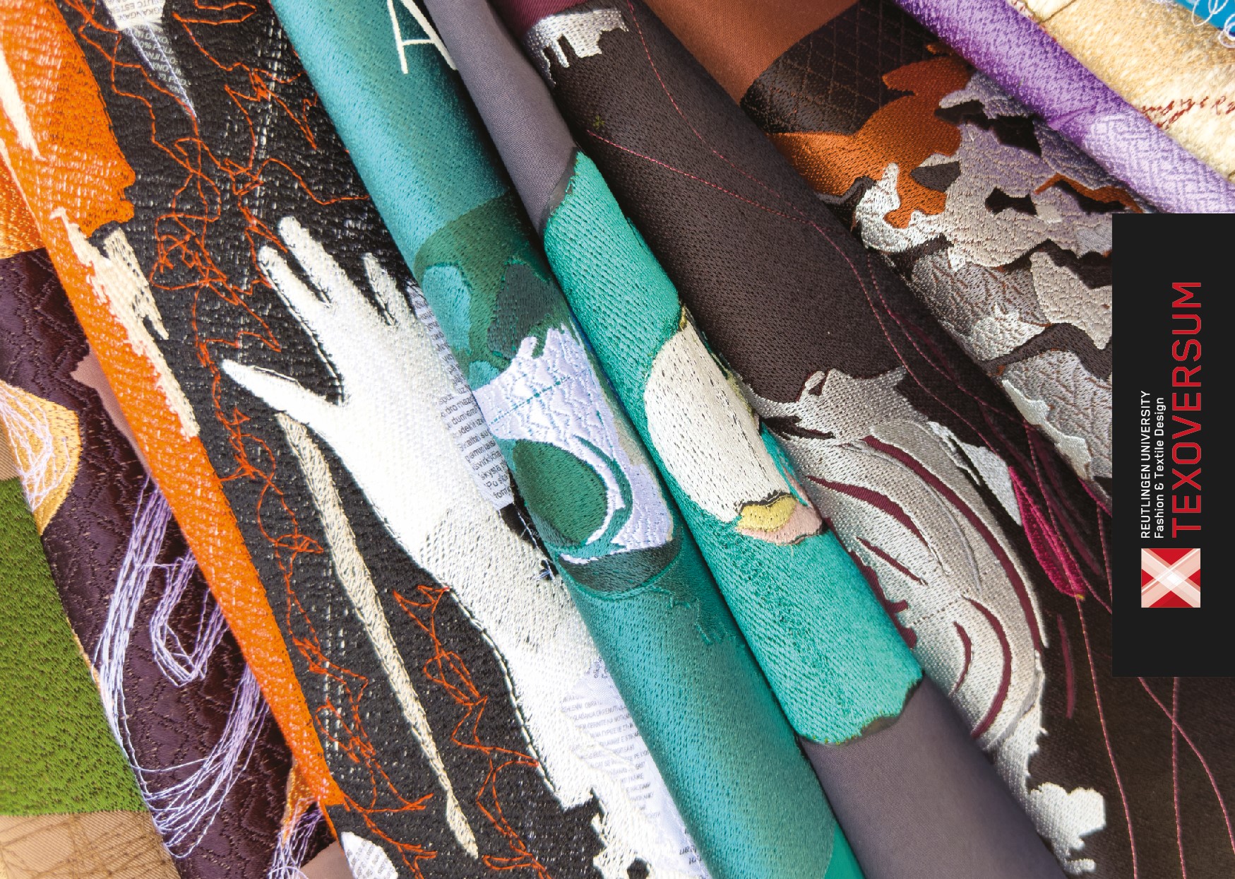 Flyer of the exhibition Friedrich List at the ESB. Fakulty of Business. Postcard design for the stand at “Premier Vision”, Paris based on a photograph of the embroidery work of the students of the Texoversum, Faculty of Textile and Design. Triptych to raise funds for the University’s textile collection.