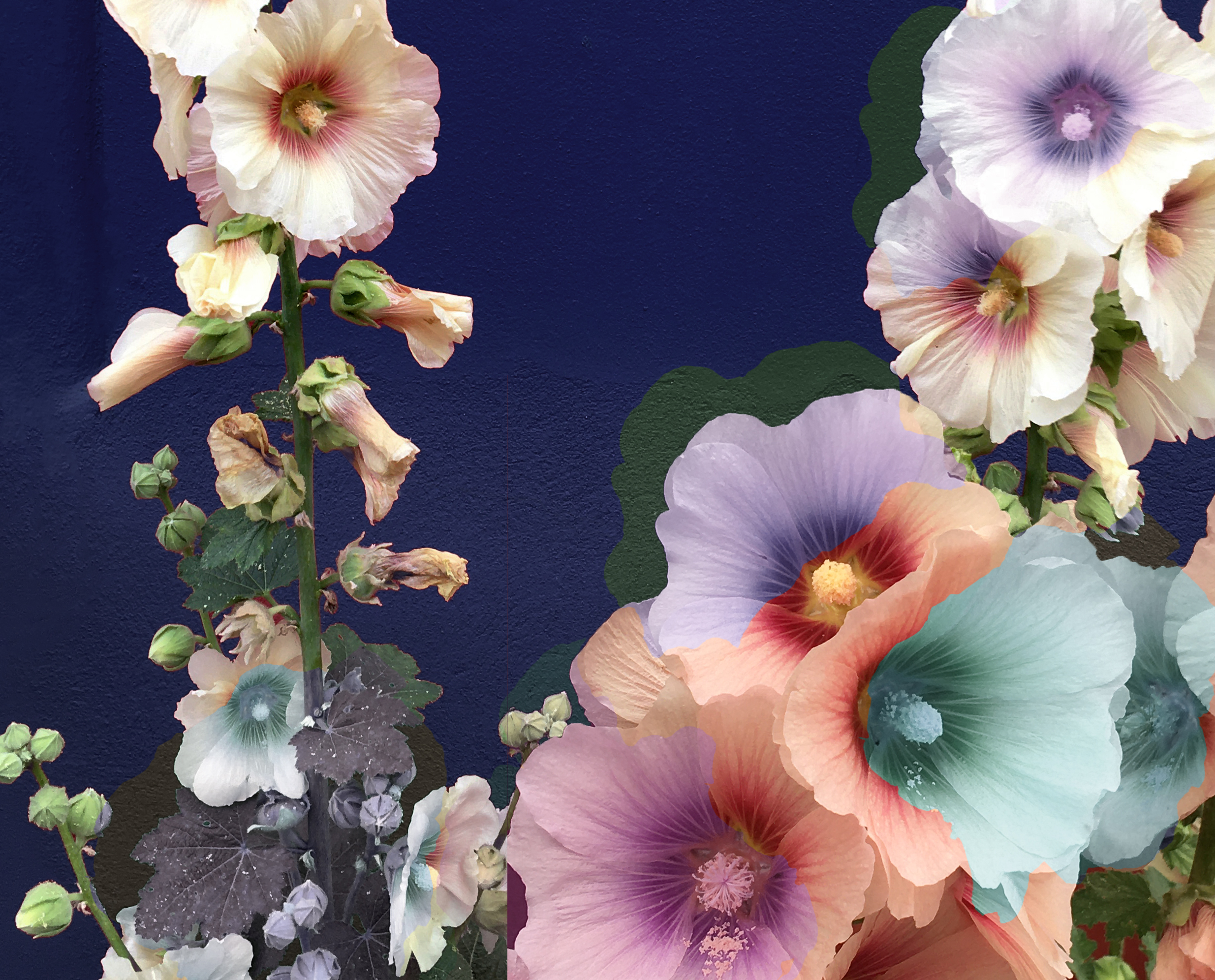 two key works: a portrait of a colleague styled as a 1920s actress and an image-collage of flowers, both digitally retouched in vibrant, citric colors.