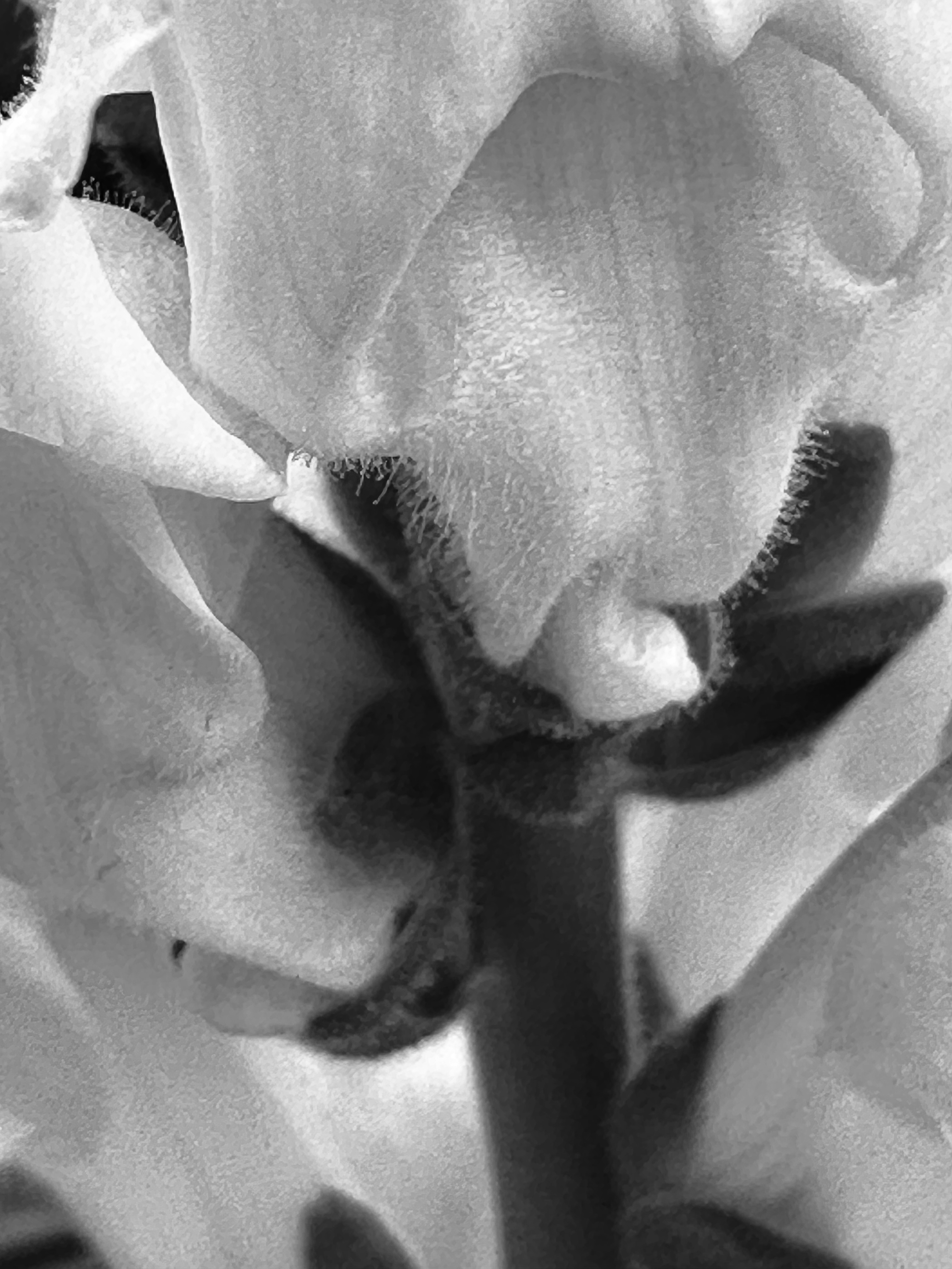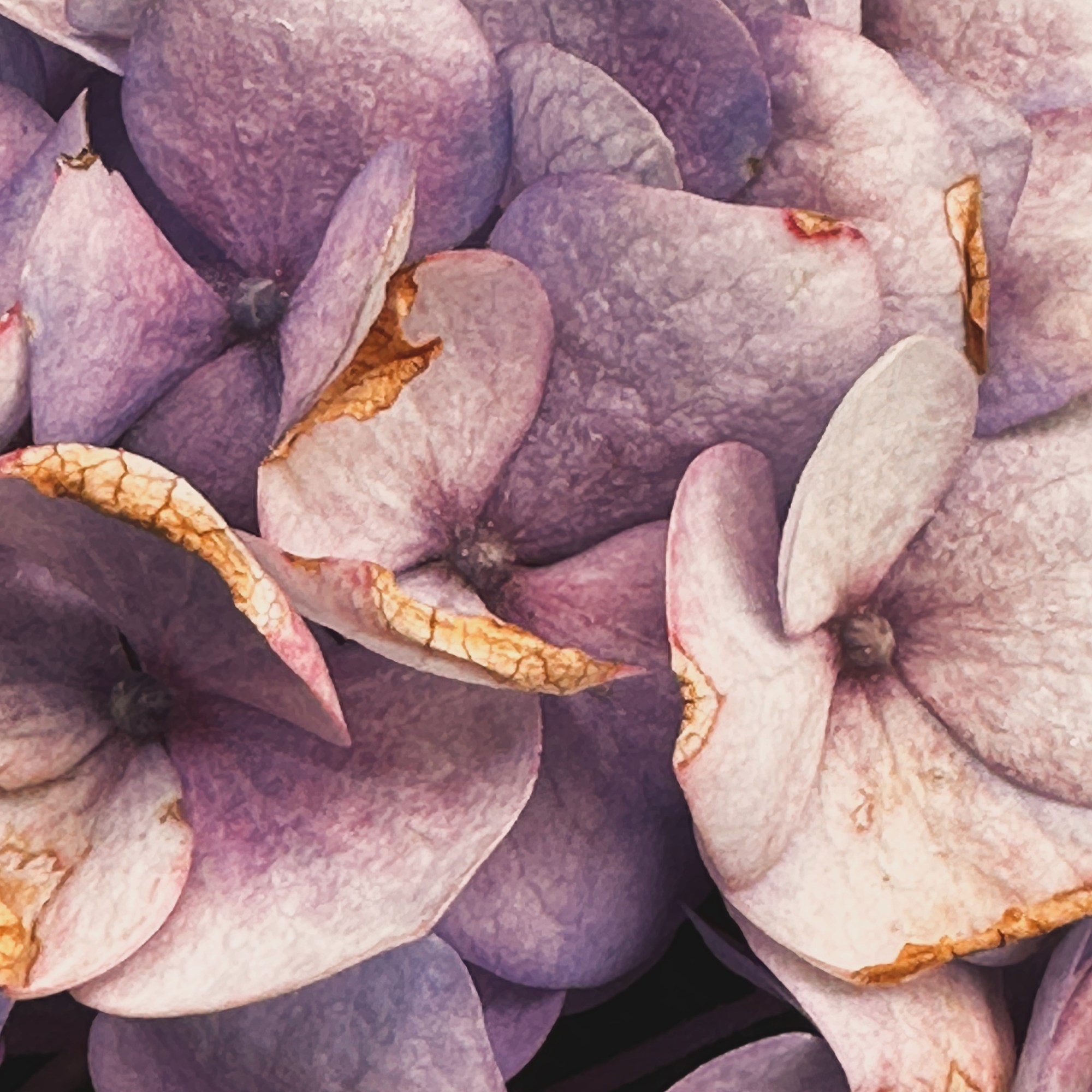 Fleshy and full of fine veins, in their translucent petals. This close-up photograph captures the intricate details and makes us focus on texture, the image transforms reality into an inspiration source. The passage of time is evident in the subtle imperfections and contrasts within the petals. The photograph highlights the harmonious interplay between the warm yellowish hues and the cool lilac tones, creating game of complementary colors. Each detail, from the fine veins to the color gradients, reveals a moment of natural beauty and imperfection.